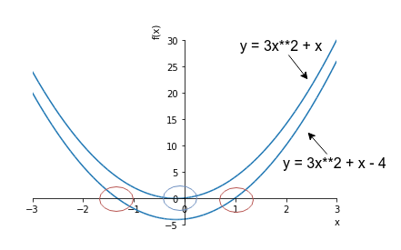 For example, if your polynomial is \(y = 3x^2 + x\), you can subtract 4 to make it \(y = 3x^2 + x - 4\). You basically moved your function 4 units “down”. If you find input values that makes this lower function 0, that is the same thing as finding input values that makes the higher (original) function 4. So, although finding roots of a polynomial is defined as finding input values that make the output 0, you can think of it a little more generally, think of it as finding the input values that produce a specific output.