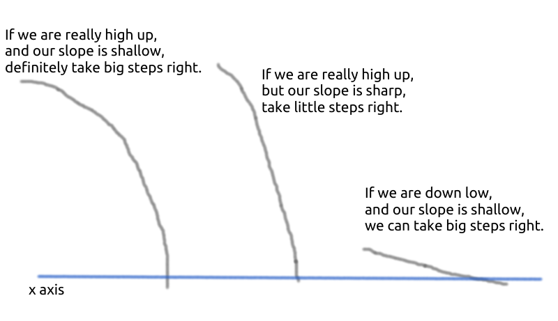 \(someFactor\) basically controls how fast you move. Like of of these “hill climbing” methods, the steps that you take are important. If you take really small steps, your computation will take longer, and if you take really big steps, you might overshoot what you’re searching for - repeatedly. The following picture should further explain why the amount we move by is \(functionMagnitude / gradientMagnitude\).